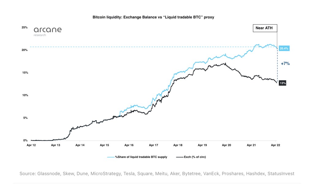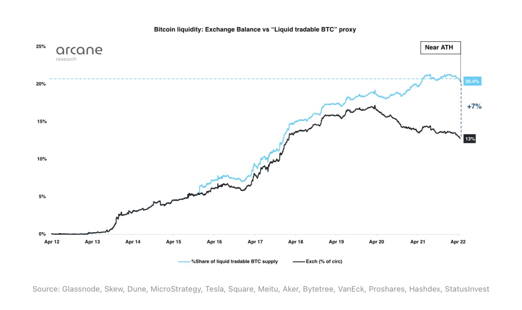 我认为,当前可交易的比特币流动供应量应为 20.4% 的流通供应量,而非从交易所余额推导出的 13%。全面了解市场情况至关重要。