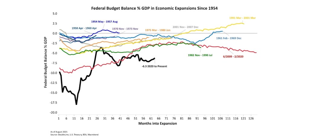 • IMF、各大機構與美國 CBO 的中期預測都指出,美國未來十多年聯邦赤字與政府債務占 GDP 比例會維持在偏高水平,如圖4所示,2020年以來,雖然聯邦預算在經濟擴張期占GDP比例從歷史最高位有所回落,但對比其他擴張期,仍處於1954年以來最高水位。