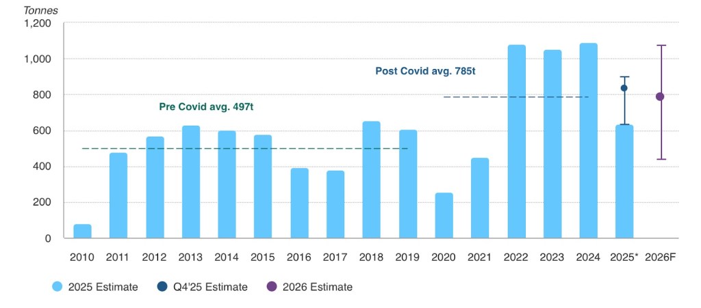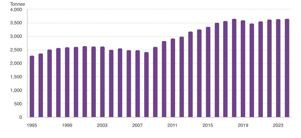 • 其中礦產供應約 3,660–3,670 噸,較 2018 年的前一高點僅高出幾噸,顯示礦產產量近年基本處於平台區
