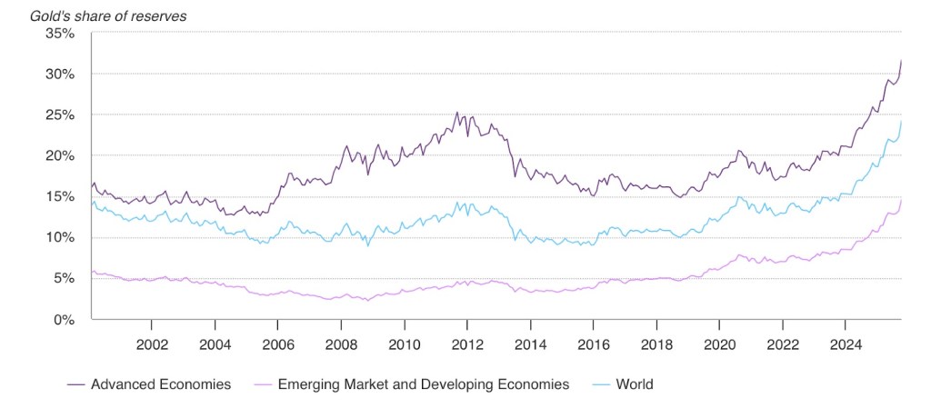 • 新興市場央行繼續以每年 600–1,000 噸的規模增持黃金,將黃金占儲備比例穩步抬高