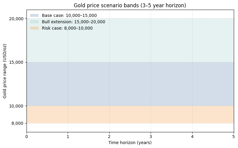 在央行持續增持、美元秩序風險未解、供給端增長有限的組合下,黃金未來三到五年很可能維持在一個底部不斷抬高,歷史新高不斷的通道內,基準情境下,我們認為價格能漲到10,000美元以上,若出現更嚴重的地緣政治、貨幣與秩序衝擊,向 15,000-20,000美元區間測試的概率需要被納入情境規劃。